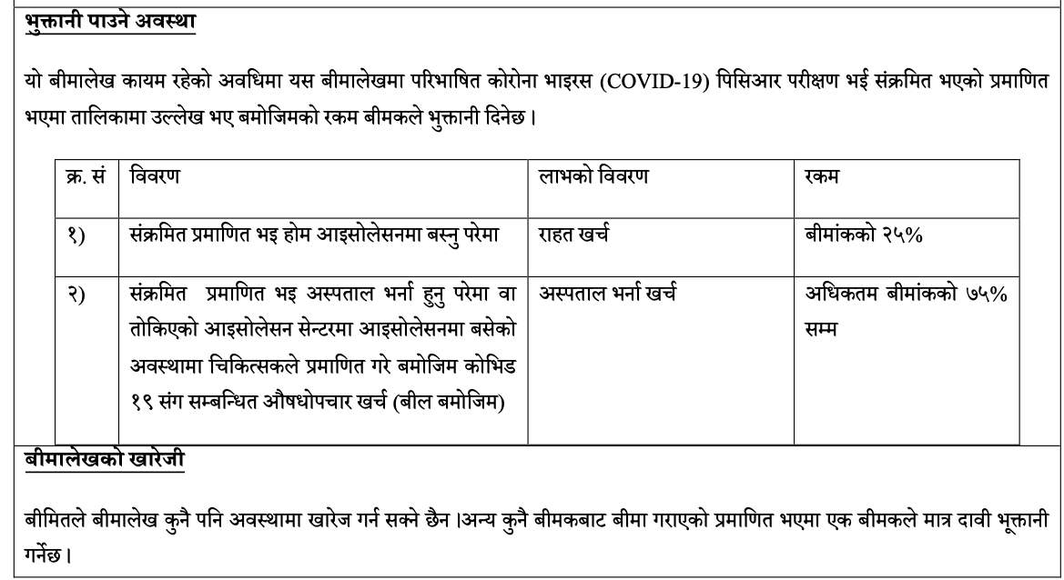 बीमा गरेको व्यक्ति अस्पतालको आइसोलेसनमा बसेको अवस्थामा बिल भर्पाई पेश गरेर थप ७५ हजार रुपैयाँ पाउने व्यवस्था मिलाइएको छ ।