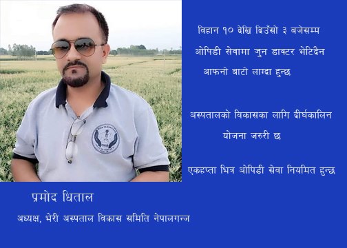 तपाईले एकदमै गम्भीर र यथार्थ विषय उठान गर्नुभयो । यो अस्पतालको चरम लापरवाही र गैरजिम्मेवार हो भन्ने मलाई लाग्छ । विहान १० बजेदेखि दिउँसो ३ बजेसम्म ओपिडीमा बसेर विरामीलाई सहज तरिकाबाट सेवा दिनुपर्ने उहाँहरुको जिम्मेवारी र दायित्व हो । सरकारले त्यही अनुसार उहाँहरुलाई खटाएको छ र सेवासुविधा पनि दिएको छ । नागरिकको करबाट सुविधा लिने ? नागरिकलाई सेवा नदिने भन्ने कुरा अव अस्पताल विकास समितिले सहन सक्दैन् । यसअघि के भए मलाई थाहा छैन । अव विहान १० देखि दिउँसो ३ बजेसम्म ओपिडी सेवामा जुन डाक्टर भेटिदैन समिति चुप लागेर बस्दैन् । भलै, अहिले कोभिडका कारण भिडभाड बढी हुँदा कोरोना भाइरसको जोखिम हुने भएकाले उहाँहरु (चिकित्सक)लाई कडाइ गर्न सकिएको छैन्। सबै विभागका इन्चार्जहरुलाई बोलाएर यो बिषयमा गम्भीर भइदिन अनुरोध गरिसकेका छौं । सरकारले उहाँहरुलाई कति समय अस्पतालमा बस्न भनेको छ । त्यो समयभित्र उहाँहरु ओपिडीमा बसेर सेवा दिनुभएन भने त्यस्ता चिकित्सकहरु आफ्नो बाटो लाग्दापनि हुन्छ । मन्त्रालयको निर्देशिकाले उहाँहरुलाई कतिबजेसम्म अस्पताल बस्न भनेको छ ? के के गर्न भनेको छ ? त्यसको कडाइका साथ पालना हुनुपर्छ। त्यसका लागि पत्रकार साथीहरुले पनि आलोचना गर्ने र टिप्पणी गर्ने काम गरिदिनुपर्छ । आम जन्तासम्म पुर्याइदिनु पर्छ । मन्त्रालय र प्रदेश सरकारले समेत यसमा अनुगमन गर्नुपर्छ । विरामीलाई सेवा दिने सवालमा कसैले खेलावड गर्न मिल्दैन त्यसमा हामी प्रतिबद्ध छौ ।