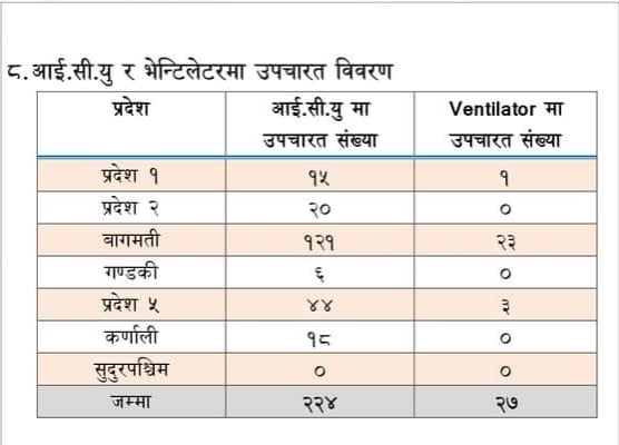 देशभर शनिवारसम्म २ सय २४ जना कोरोना संक्रमित विरामीहरुको आइसियु र २७ जनाको भेन्टिलेटरमा उपचार भैरहेको स्वास्थ्य तथा जनसंख्या मन्त्रालयले जनाएको छ।