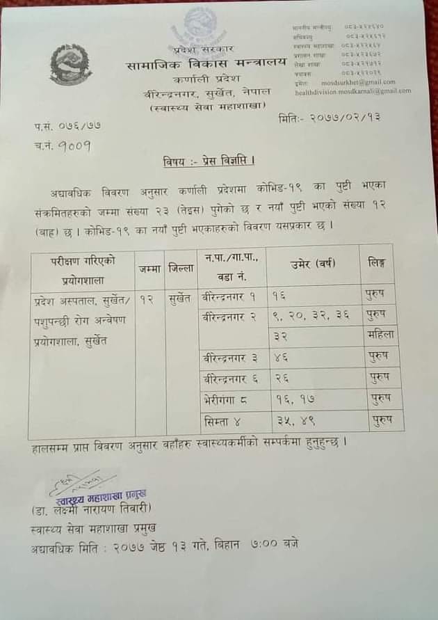 कर्णाली प्रदेशमा मंगलवार थप १२ जनामा कोरोना संक्रमण पुष्टि भएको छ । मंगलवार पुष्टि भएका सबैजना सुर्खेतका हुन् । १८ जना, २ जना भेरी गंगाका र २ जना सिम्ता गाउँपालिकाका रहेका सामाजिक विकास मन्त्रालयका स्वास्थ्य सेवा महाशाखा प्रमुख डा. नारायण तिवारीले जानकारी दिनुभयो ।