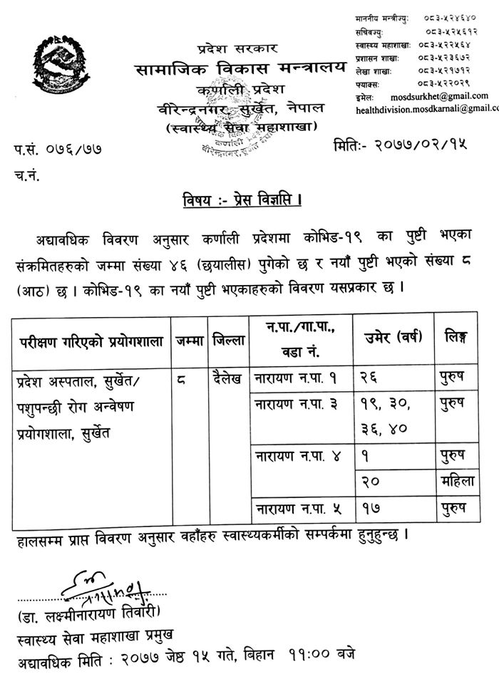 कर्णाली प्रदेश सामाजिक विकास मन्त्रालयका अनुसार नारायण नगरपालिकाका वडानम्बर १ का २६ वर्षका पुरुष, ३ का १९, ३०, ३६ र ४० वर्षका पुरुष, ४ का एक वर्षका बालक र २० वर्षकी महिला र ७ का १७ वर्षीय पुरुषलाई कोरोना पोजेटिभ देखिएको हो ।