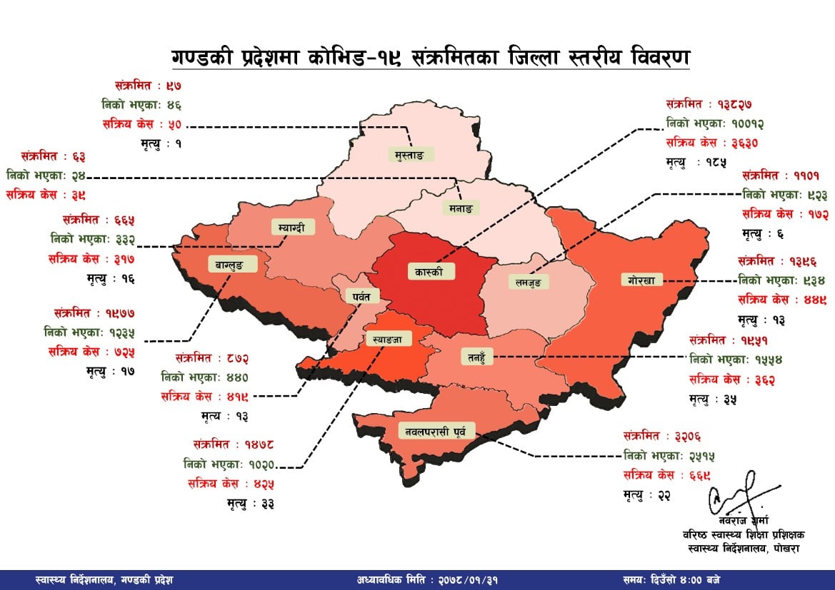 पोखरामा उपचाररत १९ जना बाँकी ४ जनाको धौलागिरी अस्पताल बागलुङमा उपचारको क्रममा मृत्यु भएको हो ।आज ६८० जनामा संक्रमण पुष्टि भएपछि प्रदेशभर हालसम्म कोभिड पुष्टि हुनेहरुको कुल संख्या २६ हजार ६३३ पुगेको छ ।