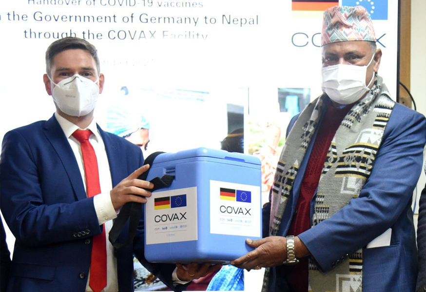 जर्मनीका राजदूत स्टेफन रुसेकले स्वास्थ्य तथा जनसंख्यामन्त्री विरोध खतिवडालाई मोडर्ना र जोन्सनको ४१ लाख ४२ हजार २५० डोज खोप प्रदान गर्नुभयो । कोभ्यासमार्फत सो परिमाणको खोप नेपालले प्राप्त गरेको हो ।