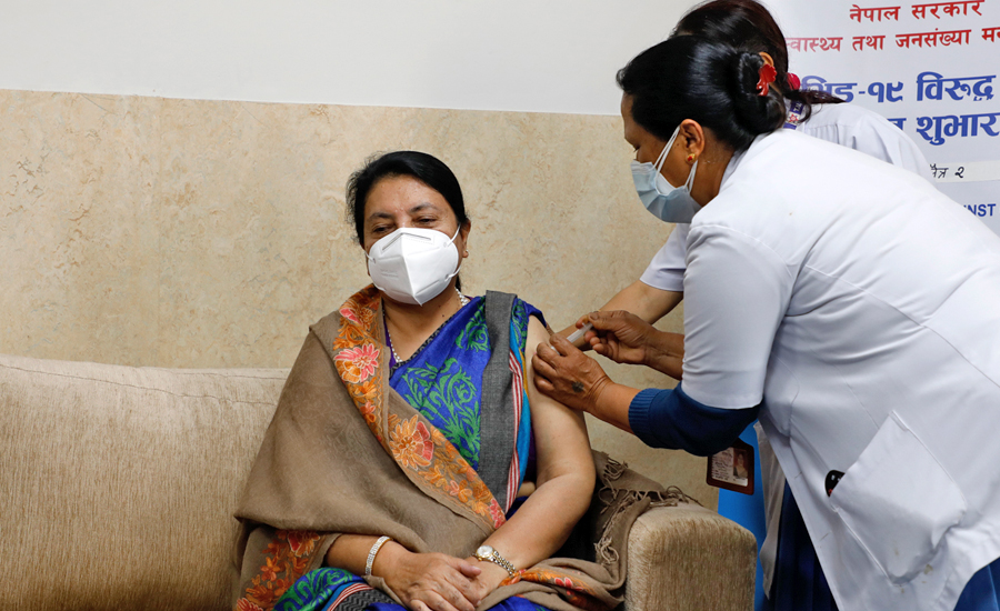 काठमाडौंः राष्ट्रपति विद्यादेवी भण्डारीले कोरोना विरुद्धको खोप लगाउनुभएको छ । खोप लगाउन उहाँ त्रिवि शिक्षण अस्पताल, महाराजगञ्जको खोप केन्द्रमा पुग्नुभएको थियो । कोरोना खोप लगाएपछि सञ्चारकर्मीलाई संक्षिप्त प्रतिक्रिया दिँदै राष्ट्रपति भण्डारीले आफ्नै उमेर समूह पर्खिएर बसेकी तर बंगलादेश भ्रमणमा जानु पर्ने भएकाले खोप लगाएको बताउनुभयो ।
