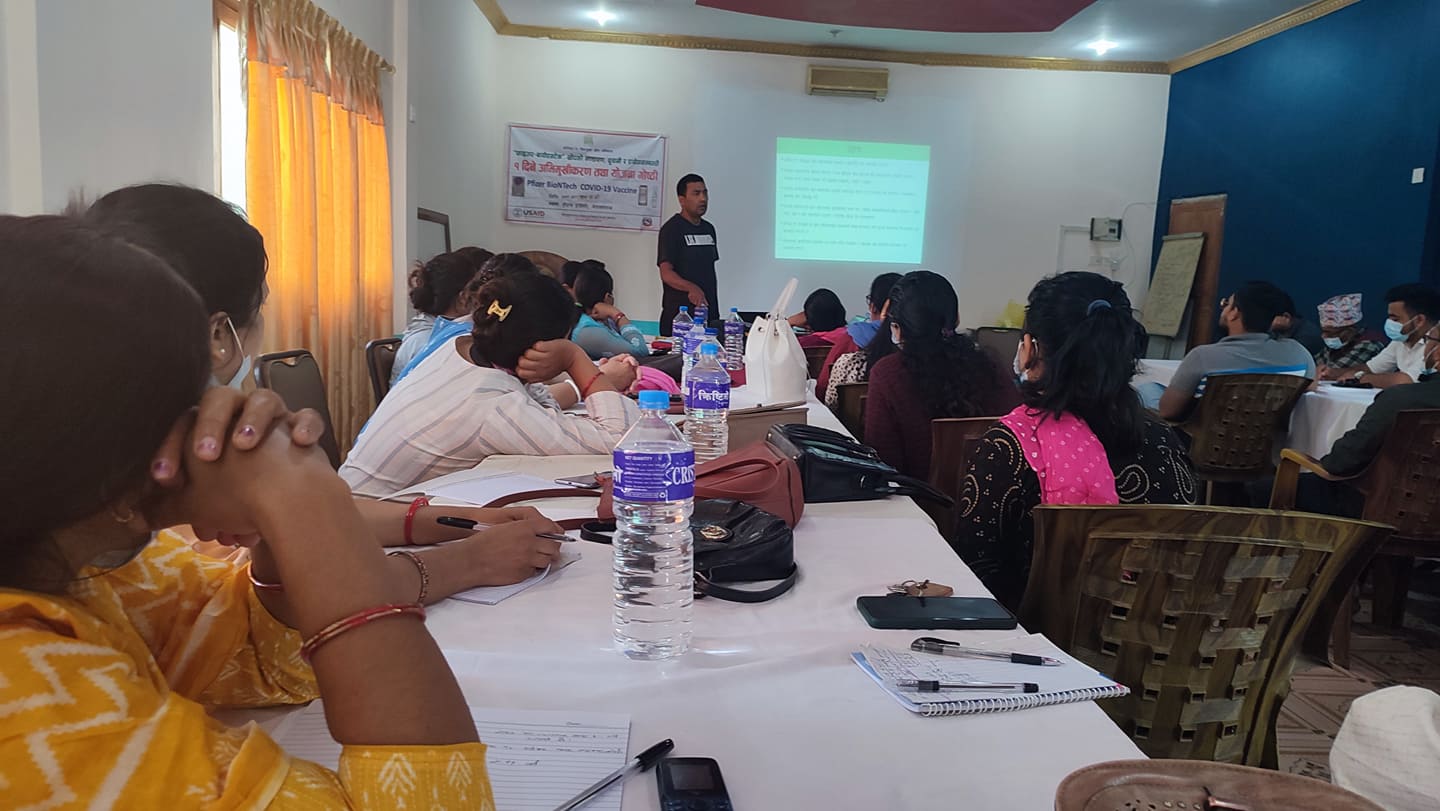 गोष्ठिको सहजकर्ता समेत रहनुभएका उहाँले सहभागीहरुलाई खोपको भण्डारण, ढुवानी र प्रयोगसम्बन्धी जानकारी गराउनुभएको थियो । स्वास्थ्यका लागि सक्षम प्रणालीकी रोशनी पुनका अनुसार नौ चरणमा गरेर खोप फोकलपर्सन र वडाका खोप कार्यकर्ताहरुलाई अभिमुखिकरण गरिएको जानकारी दिनुभयो ।