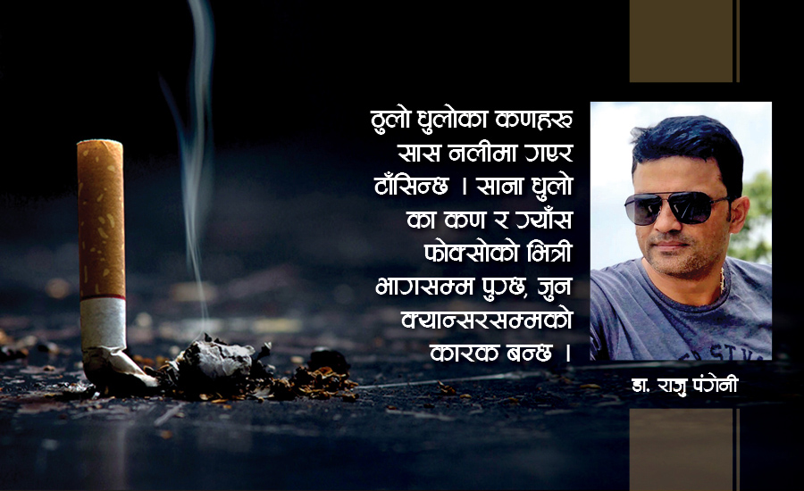 आखिर मान्छेमा कसरी चुरोटको लत लाग्छ ? कसरी अम्मली बन्छन् ? चुरोटमा त्यस्तो के तत्व हुन्छ, जसले तलतल लगाइरहन्छ ? यो बेग्लै खोजको विषय हो । यद्यपि जब कुनै व्यक्तिले चुरोटको धुँवा तान्छ, त्यसले फोक्सोमा कस्तो असर पुर्याउँछ ? त्यसका दीर्घकालीन जोखिम के-के हुन् ? यिनै विषयमा आधारित रहेर वरिष्ठ छातीरोग विशेषज्ञ डा. राजु पंगेनीसँग सुमित्रा लुइटेलले गरेको कुराकानीको सम्पादित अंश :