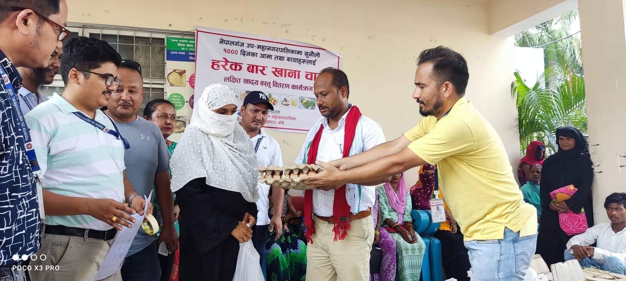 नेपालगन्ज उपमहानगरपालिकाभित्र सुनौलो १००० दिनका अति विपन्न तथा गरिव गर्भवति तथा सुत्केरीहरुलाई पोषिलो खाद्य वस्तु वितरण सुरु गरिएको स्वास्थ्य महाशाखाका जनस्वास्थ्य निरीक्षक जागेश्वर वस्नेतले जानकारी दिनुभयो ।