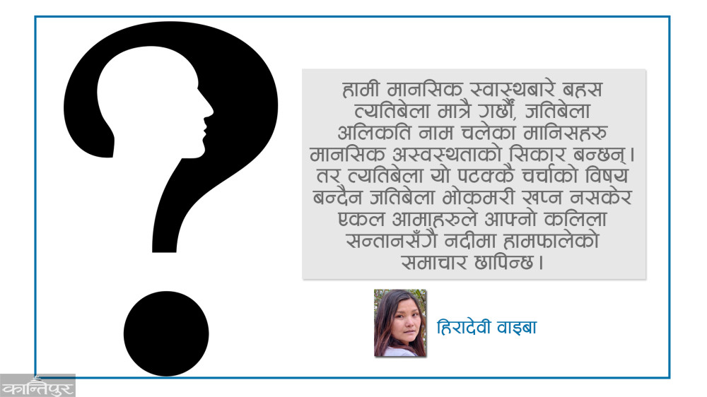 हामी मानसिक स्वास्थबारे बहस त्यतिबेला मात्रै गर्छौं, जतिबेला अलिकति नाम चलेका मानिसहरु मानसिक अस्वस्थताको सिकार बन्छन्। तर त्यतिबेला यो पटक्कै चर्चाको विषय बन्दैन जतिबेला भोकमरी खप्न नसकेर एकल आमाहरुले आफ्नो कलिला सन्तानसँगै नदीमा हामफालेको समाचार छापिन्छ। के उनीहरुको मानसिक स्वास्थ हुँदैन? के हाम्रो वकालत पक्षपाती होइन?