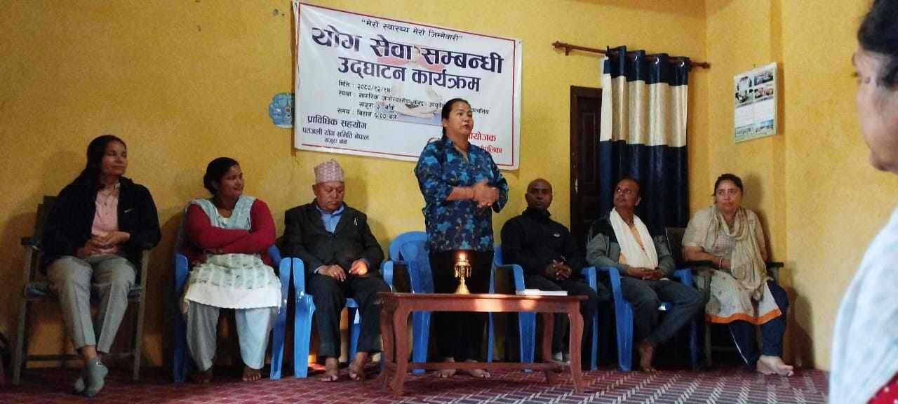योग सेवा शुभारम्भ  खजुरा गाउँपालिकाका उपाध्यक्ष मन्जु मल्लले गर्नुभयो । नियमित योग गर्नका लागी आयुर्वेद शाखाले सेवाको सुभारम्भ गरेको शाखा प्रमुख किरण खनालले जानकारी दिनुभयो ।