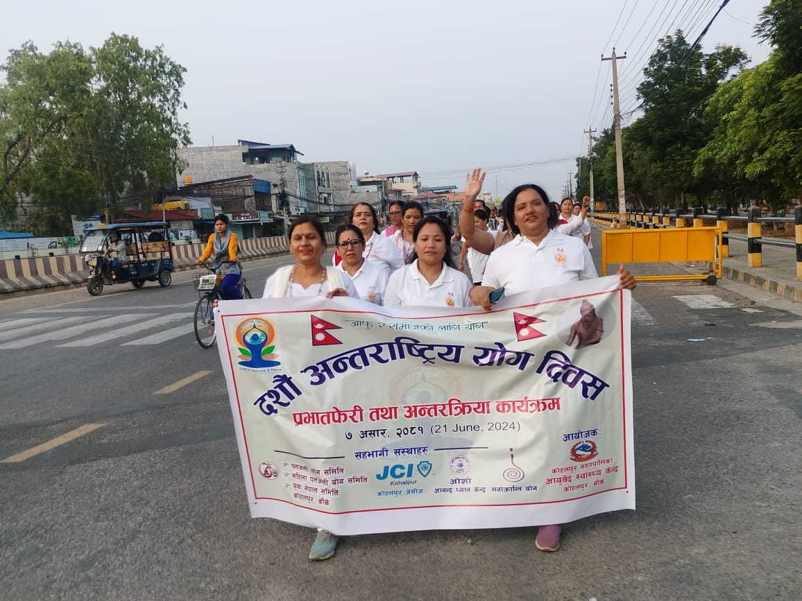 कोहलपुरः आफु र समाजका लागि योग भन्ने मुल नाराका साथ आज कोहलपुरमा दशौं अन्तर्राष्ट्रिय योग दिवस मनाइएको छ । कोहलपुर नगरपालिका आयुर्वेद शाखाको आयोजनामा प्रभातफेरी, अन्तरक्रिया लगायतको कार्यक्रमको आयोजना गरी दिवस मनाइएको हो ।