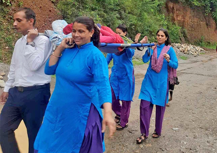 नेपालगन्जः प्युठानमा स्वास्थ्यकर्मीले सुत्केरीलाई बोकेर घरै पुर्याइदिएका छन् । ऐरावती गाउँपालिका–६, काल्नेकी ३० वर्षीया जिवा विकलाई शनिबार साँझ सुत्केरी व्यथा सुरु हुँदा बाहिर झमझम् पानी परिरहेको थियो । तीन दिनअघिबाटै जिवाको तल्लो पेट दुखिरहेको थियो ।