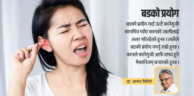 बडको प्रयोग गर्दा उल्टै कानेगुजी कानभित्र पसेर कानको जालीलाई असर गरिरहेको हुन्छ । त्यसैले बडको प्रयोग नगर्नु राम्रो हुन्छ । कानले कानेगुजी आफैँ सफा हुने मेकानिजम् बनाएको हुन्छ । कानले जति कानेगुजी चाहिने हो त्यो राखेर बाँकी कानेगुजी आफैँ फाल्छ । यस्तै, कान पाक्ने समस्यासम्बन्धी आम जनमानसमा जनचेतना फैलाउन जरुरी छ ।
