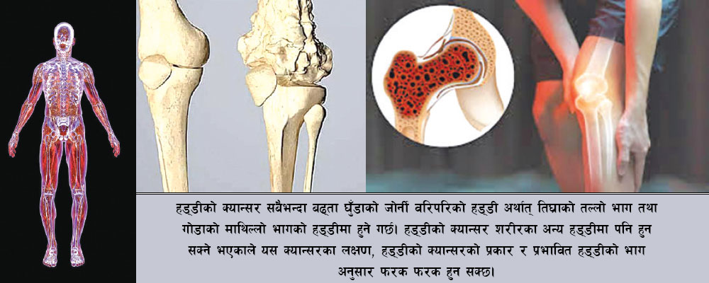 हड्डीको क्यान्सर सबैभन्दा बढ्ता घुँडाको जोर्नी वरिपरिको हड्डी अर्थात् तिघ्राको तल्लो भाग तथा गोडाको माथिल्लो भागको हड्डीमा हुने गर्छ । हड्डीको क्यान्सर शरीरका अन्य हड्डीमा पनि हुन सक्ने भएकाले यस क्यान्सरका लक्षण हड्डीको क्यान्सरको प्रकार र प्रभावित हड्डीको भाग अनुसार फरक फरक हुन सक्छ ।