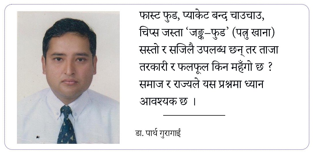 पहिले कुरा गरौँ, सस्तो अस्वस्थ खानाको । फास्ट फुड, प्याकेट बन्द चाउचाउ, चिप्स जस्ता ‘जङ्क–फुड’ (पत्रु खाना) सस्तो र सजिलै उपलब्ध छन् तर ताजा तरकारी र फलफूल किन महँगो छ ? समाज र राज्यले यस प्रश्नमा ध्यान आवश्यक छ ।