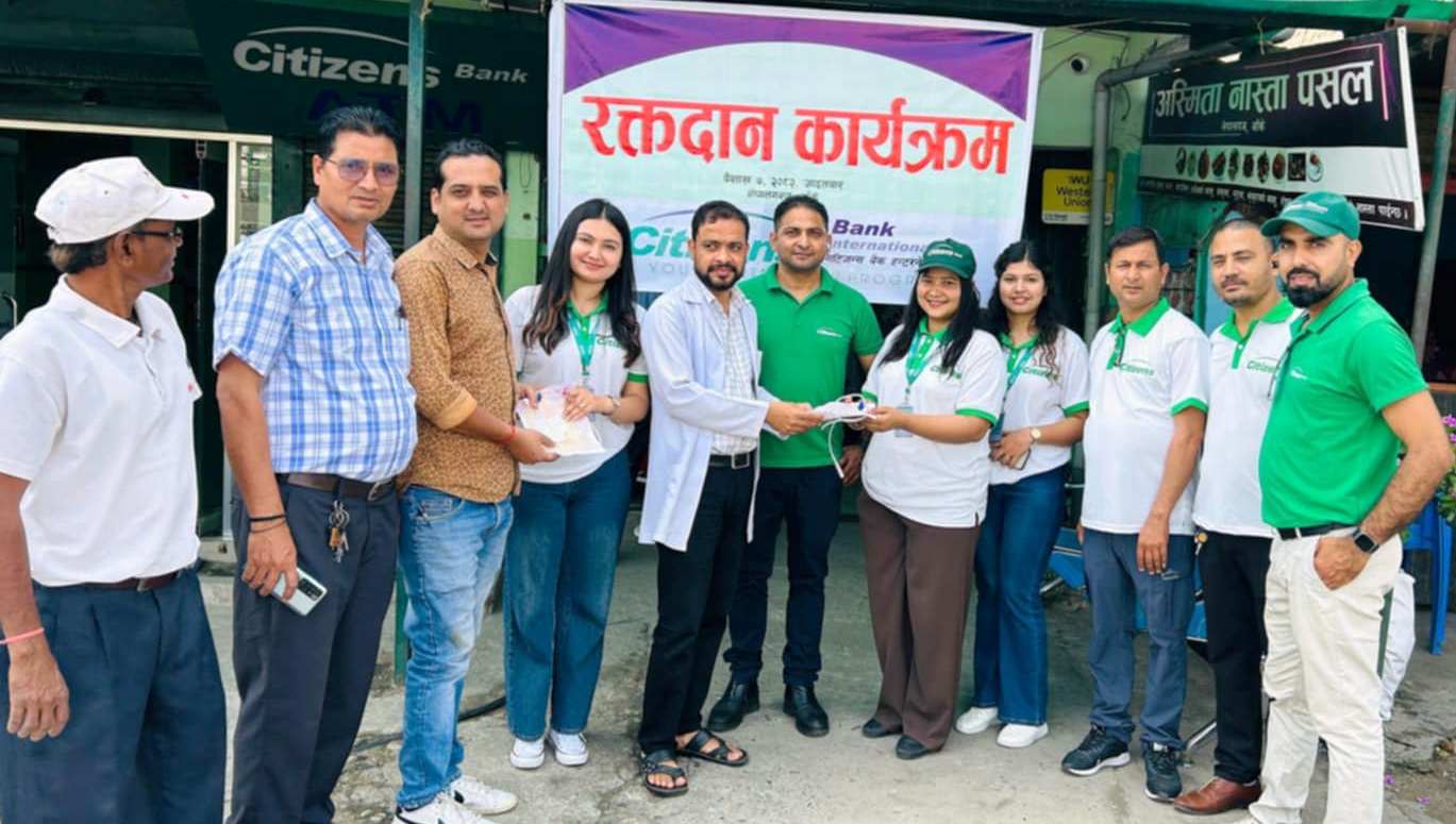 नेपालगन्जः सिटिजन्स बैंक इन्टरनेशनल लिमिटेडको १८ औं वार्षिकोत्सवको अवसरमा बैशाख ७ गते आइतवार बैंक कर्मचारी, पत्रकार, व्यवसायी महिला पुरुष गरी ६४ जनाले बैशाख ७ गते रक्तदान गरेका छन् । सिटिजन्स बैंक इन्टरनेशनल लिमिटेड नेपालगन्ज शाखाको आयोजनामा १८ औं वार्षिकोत्सवको अवसरमा आयोजित रक्तदान कार्यक्रममा कोहलपुर शाखाका प्रबन्धक दिनेश कुमार ढुंगाना र नेपालगन्ज शाखाका प्रबन्धक बिनोद कुवँरले प्रादेशिक रक्त सञ्चार सेवा केन्द्र नेपालगन्जका प्राविधिक सोम प्रकाश सापकोटालाई सुनिता ओली, बर्षा कुमारी खडकालाई प्राबिधिक सन्दिप आचार्यलाई संयुुक्त रुपमा रगत संकलन गर्ने पाकेट हस्तान्तरण गरी कार्यक्रमको शुभारम्भ गरेका थिए ।