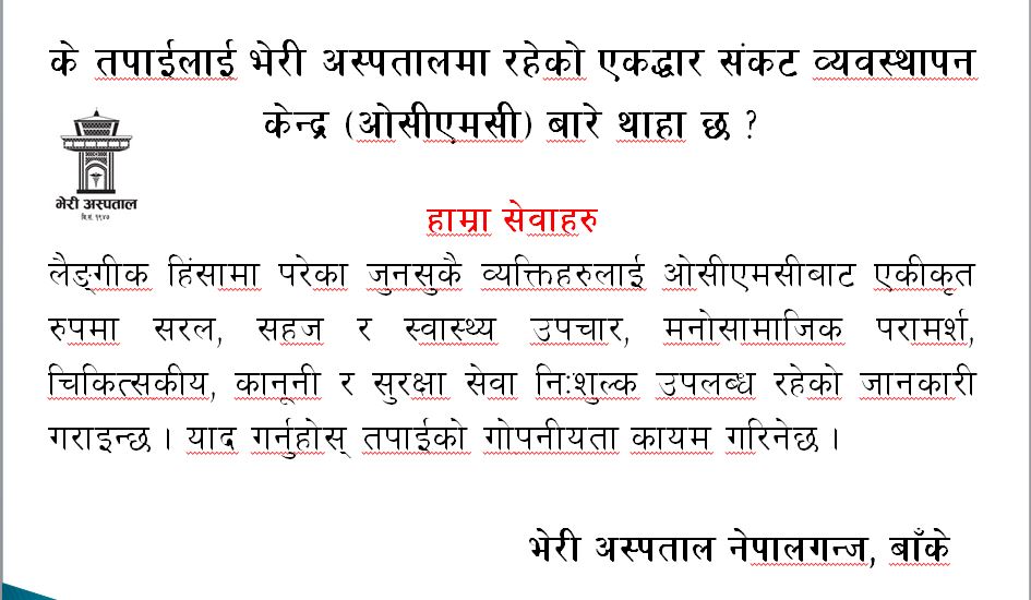 अस्पतालका प्रमुख मेडिकल सुपरिन्टेन्डेन्ट डा.निराजन सुवेदीले पर्सि बुधवारबाट सो सेवा सुरु गरिने स्वास्थ्य पेजलाई जानकारी दिए । उनका अनुसार अहिलेसम्म जेष्ठ नागरिक, सिकलसेल तथा थालेसिमिया, सामान्य डायलाइसिस, स्पाइन इन्जुरी, हेड इन्जुरी र मुटुका बिरामीहरुले विपन्न नागरिक औषधि उपचार कार्यक्रमबाट निःशुल्क सेवा लिँदै आएका थिए । यस्तै भेरी अस्पताललाई मिर्गौला प्रत्यारोपण र पेरिटोनियल डायलाइसिसका लागि पनि सूचिकृतको अन्तिम तयारी थालिएको छ ।