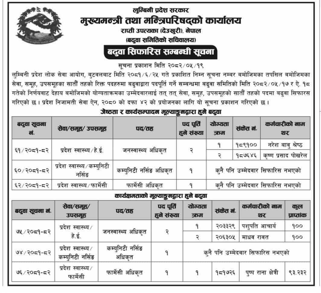 नेपालगन्ज: लुम्बिनी प्रदेश लोक सेवा आयोगले स्वास्थ्यतर्फ सातौ तहको रिक्त पदहरुमा बढुवामार्फत पदपूर्ति गरेको छ ।