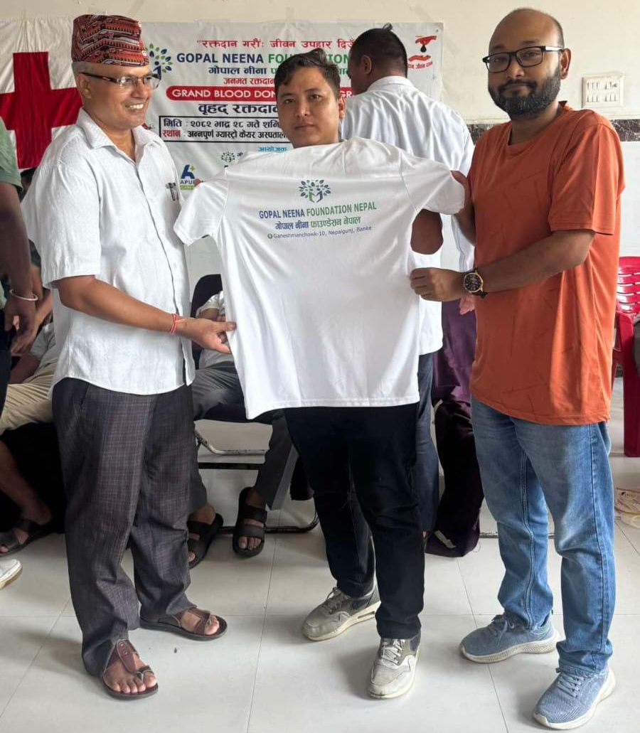 सो अवसरमा रक्तदाताहरुलाई फाउण्डेसनकी सह–निर्देशक डा. तृप्ती पाल रमण, नेपाल स्वयंसेवी रक्तदाता समाज बाँकेकी अध्यक्ष दिला शाह, जनमत अद्र्ध साप्ताहिकका सम्पादक पूर्णलाल चुके, राप्ती सोनारी गाउँपालिका वार्ड नं.६ का वडाध्यक्ष तथा नेपाल स्वयंसेवी रक्तदाता समाज राप्ती सोनारीका सल्लाहकार लवराज खरेल, हेल्थ याद आयो मोवाइल एप कम्पनीका कार्यकारी प्रमुख प्रज्वल चुके, फाउण्डेशनका कार्यालय प्रमुख दिलिप गिरी, वरिष्ठ पत्रकार शंकर प्रसाद खनालले टिशर्त हस्तान्तरण गर्नु भएको थियो ।