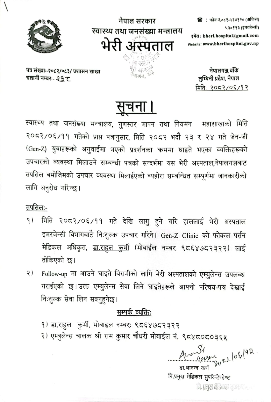 भेरी अस्पतालका निमित्त मेसु डा आनन्द कर्णद्वारा जारी सूचना अनुसार अस्पतालको इमर्जेन्सी विभागबाट सेवा दिने गरि जेनजी क्लिनिक स्थापना गरिएको हो । त्यसका लागि मेडिकल अधिकृत डा राहुल कुर्मीलाई फोकल पर्सन तोकिएको अस्पतालले जानकारी दिए ।