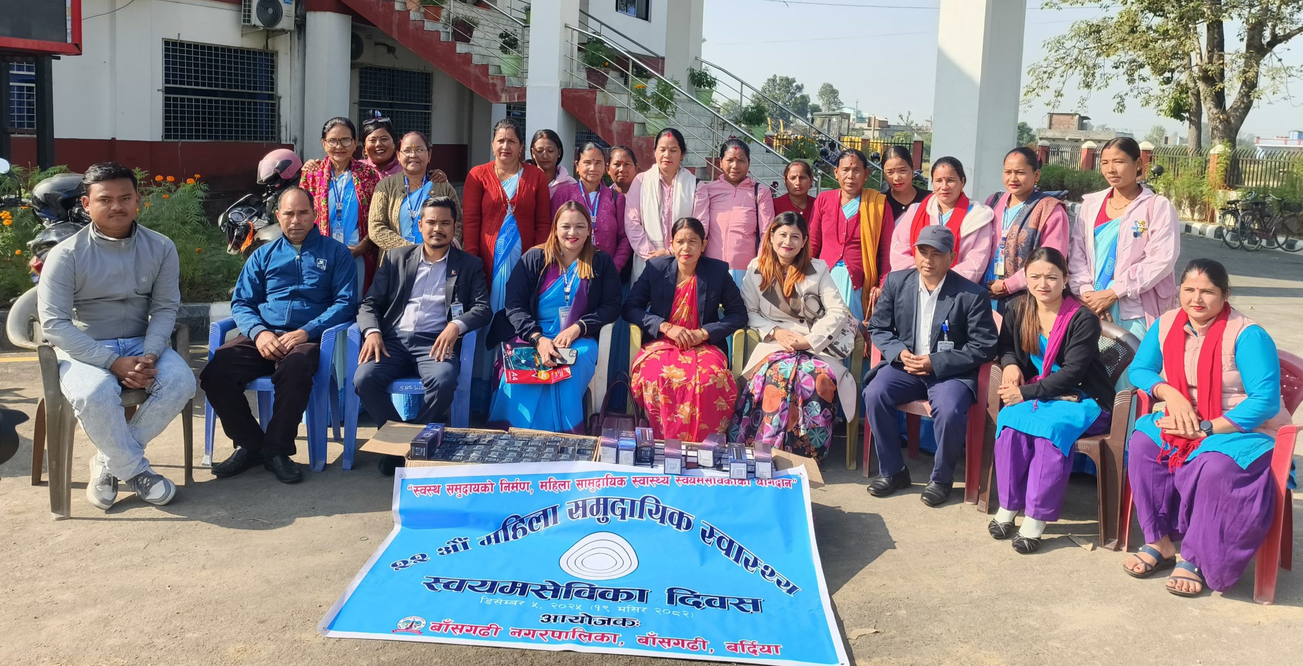 नेपालगन्ज: २२औं राष्ट्रिय सामुदायिक स्वास्थ्य स्वयंसेविका दिवसको अवसरमा बर्दिया बाँसगढी नगरपालिकाका स्वयंसेविकालाई डिजिटल थर्मस बितरण गरिएको छ । वर्षौंदेखि समुदायको स्वास्थ्य सुरक्षाका अगाडि उभिएर सेवा पुर्याउँदै आएका १०३ जना स्वास्थ्य स्वयंसेविकालाई डिजिटल थर्मस वितरण गरिएको हो ।