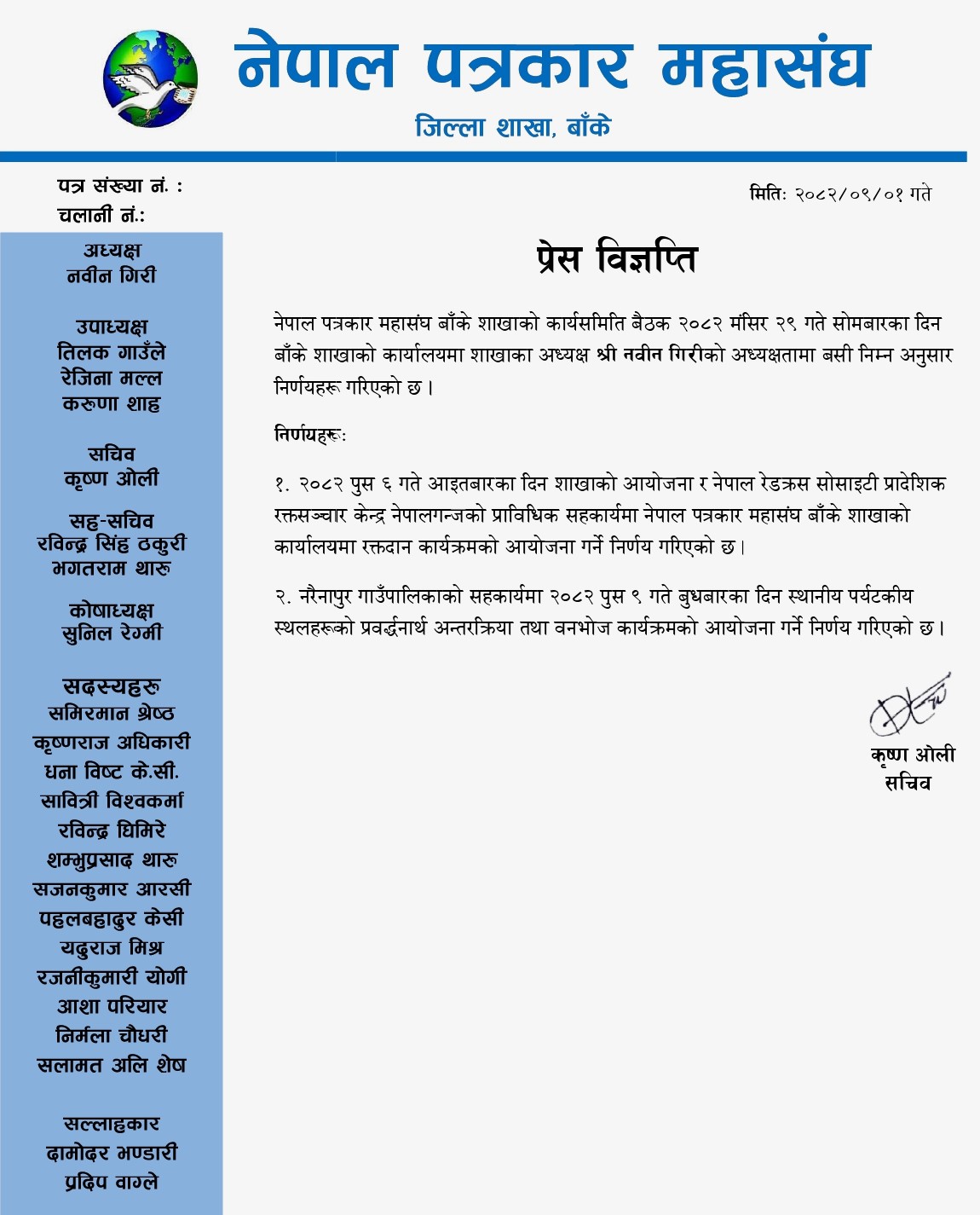 कार्यक्रम नेपाल पत्रकार महासंघ बाँके शाखाको कार्यालयमा आयोजना गरिनेछ । रक्तदान कार्यक्रमले समुदायमा रक्त अभाव कम गर्ने र मानव सेवामा योगदान पुर्याउने विश्वास व्यक्त गरिएको छ ।
