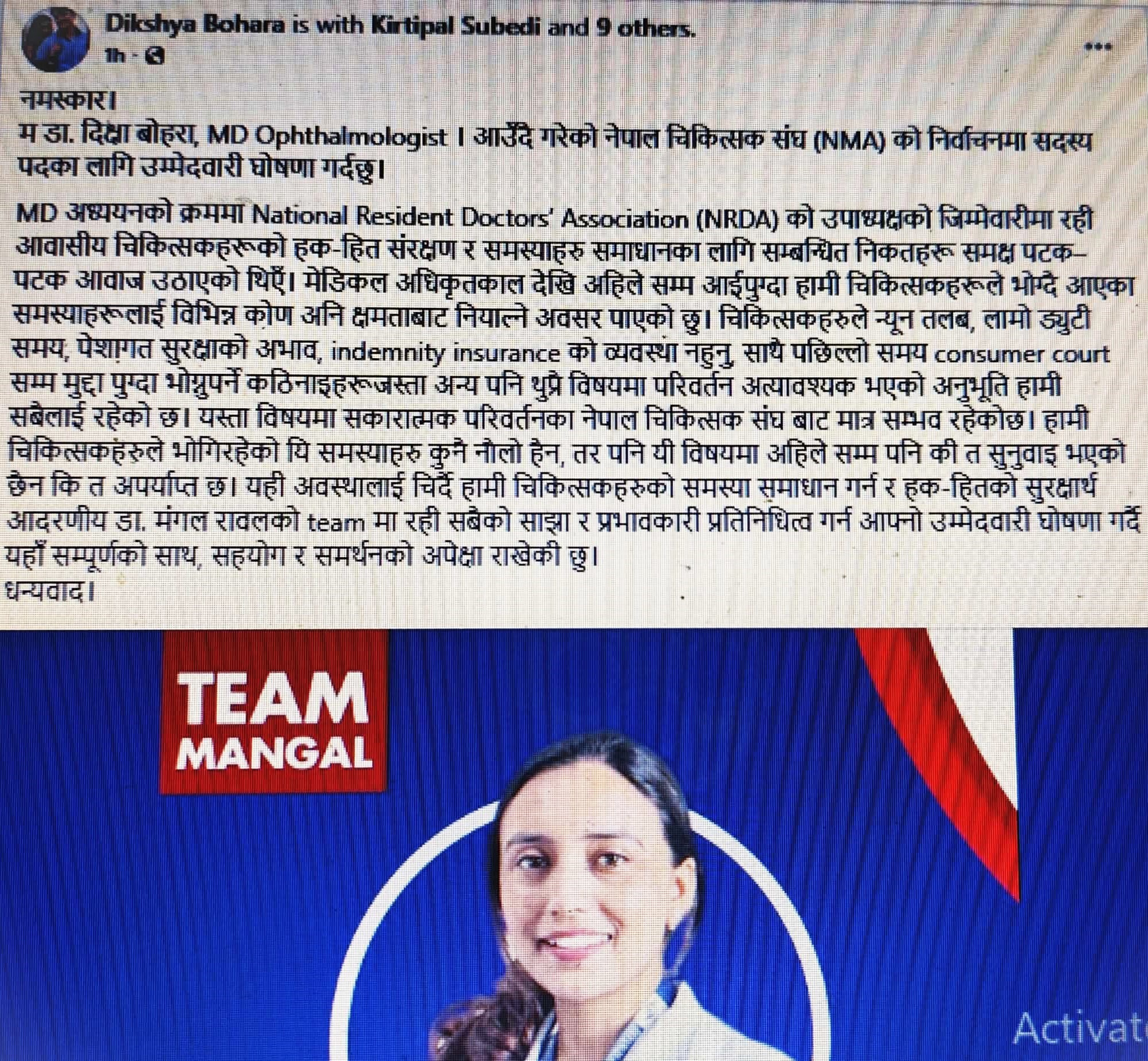 काठमाडौं: नेपाल चिकित्सक संघ (एनएमए) को आसन्न निर्वाचनमा नेत्ररोग विशेषज्ञ डा. दिक्षा बोहराले सदस्य पदका लागि उम्मेदवारी दिएकी छन् । डा. बोहराले चिकित्सकहरूको पेशागत हक–हित संरक्षण र संस्थागत सुधारका लागि आफू निर्वाचनमा होमिएको स्पष्ट पारेकी छन् ।