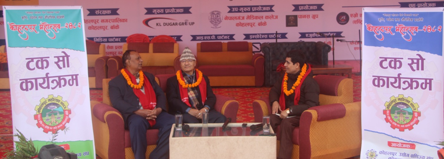 नेपालगन्ज: स्वास्थ्य नीति, बजेट र सेवाको यथार्थ अवस्थामाथि गहिरो बहस गर्दै कोहलपुर उद्योग वाणिज्य संघको आयोजनामा कोहलपुर महोत्सवभित्र शनिवारदेखि टक–शो कार्यक्रम सुरु भएको छ । कार्यक्रमको पहिलो सेसनमा ‘हाम्रो स्वास्थ्य–सबैको सरोकार’ विषयमा केन्द्रित बहस गरिएको हो । पहिलो सेसनका वक्ताका रुपमा स्वास्थ्य मन्त्रालयका पूर्व अतिरिक्त सचिव डा. श्याम सुन्दर यादव र नेपालगन्ज मेडिकल कलेज शिक्षण अस्पताल कोहलपुरका निर्देशक प्रा. डा. रेशम बहादुर राना थिए । पत्रकार प्रियास्मृति ढकालले सहजीकरण गरेको उक्त सेसनमा दुवै वक्ताले नेपालको स्वास्थ्य प्रणालीमा भएका उपलब्धि, कमजोरी र सुधारका बाटोबारे अनुभवजन्य धारणा राखे ।