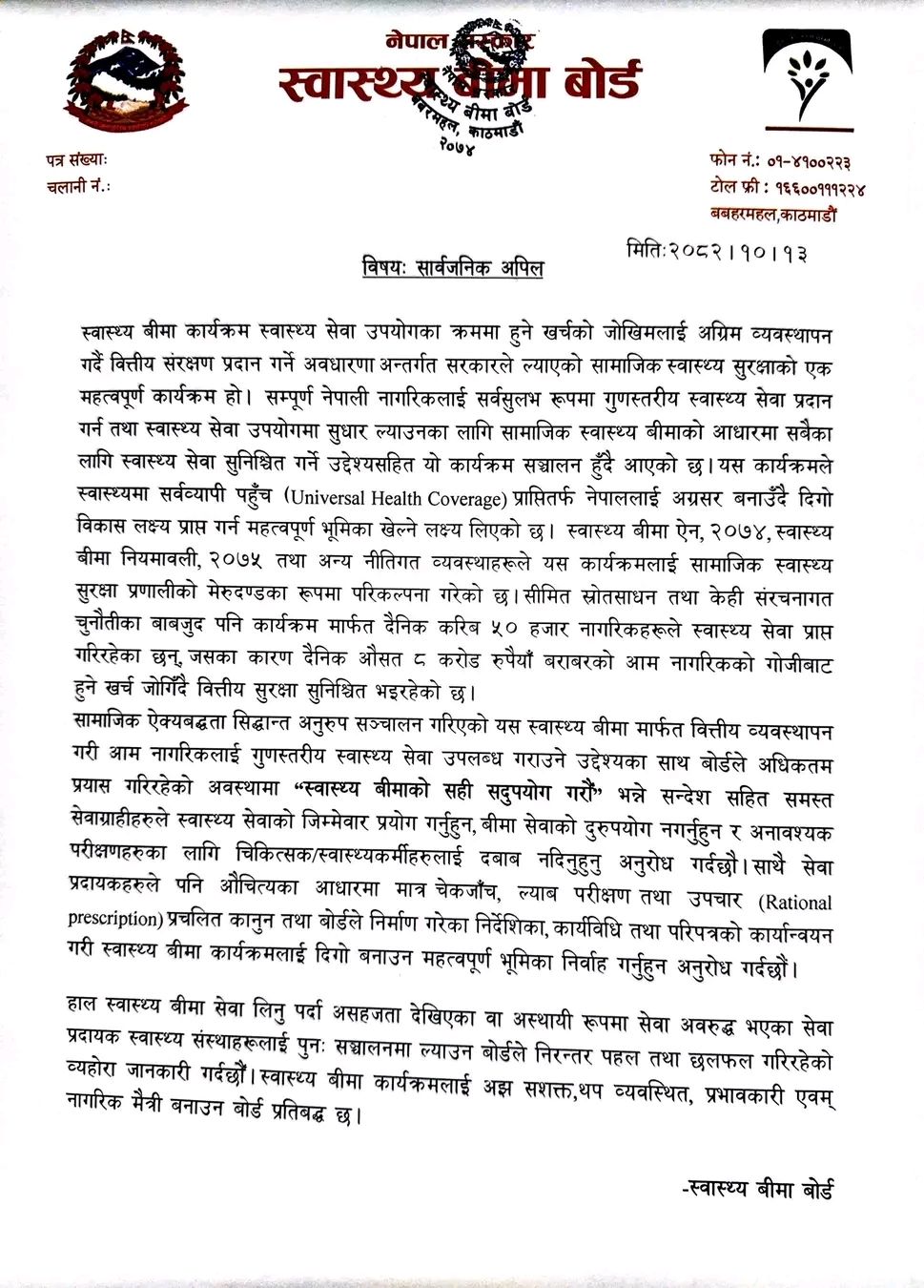 यसै सन्दर्भमा बोर्डले सेवाग्राहीलाई चिकित्सक तथा स्वास्थ्यकर्मीमाथि अनावश्यक जाँच तथा परीक्षणका लागि दबाब नदिन र बीमाको दुरुपयोग नगर्न आग्रह गरेको छ । साथै सेवा प्रदायक स्वास्थ्य संस्थाहरूलाई पनि औचित्यका आधारमा मात्र चेकजाँच, ल्याब परीक्षण तथा उपचार गर्न निर्देशन दिएको छ ।