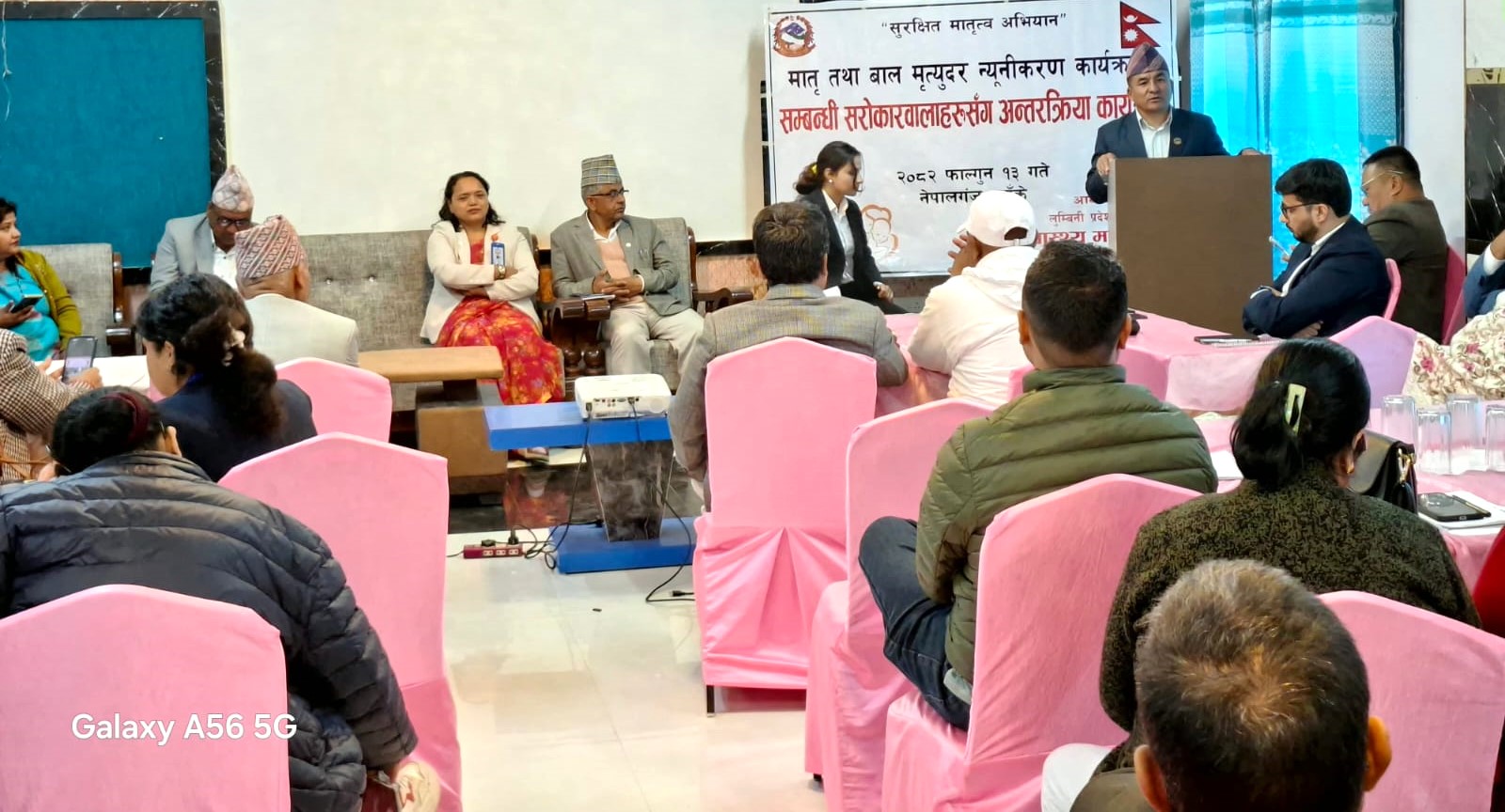 नेपालगन्ज: लुम्बिनी प्रदेशका स्वास्थ्यमन्त्री खेमबहादुर सारुले लुम्बिनी प्रदेशमा मातृ तथा नवजात शिशु मृत्युदर न्यूनीकरणका लागि ‘सुरक्षित मातृत्व अभियान’ले सघाउ पुर्‍याउने बताएका छन् । प्रदेश सरकार, स्वास्थ्य मन्त्रालयले बाँके, बर्दिया, दाङ र प्युठानका स्थानीय तहका जनप्रतिनिधि तथा स्वास्थ्यकर्मीलगायत सरोकारवालासँग आज नेपालगन्जमा आयोजना गरेको अन्तरक्रिया कार्यक्रममा मन्त्री सारुले त्यसका लागि १२ करोड ७४ लाख बजेट विनियोजन गरेर कार्यान्वयन सुरु गरिएको बताए ।