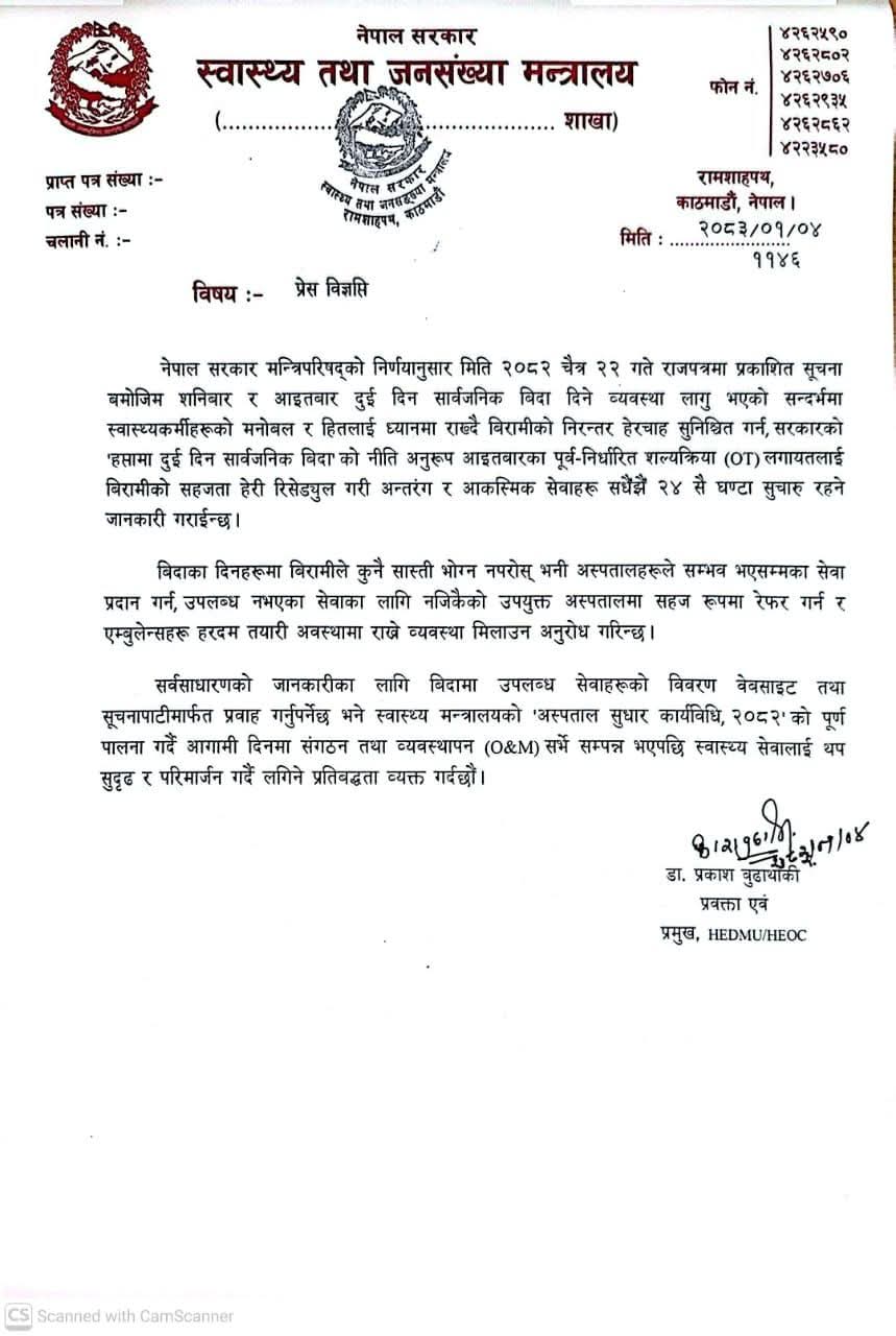 मन्त्रालयले शुक्रबार जारी गरेको विज्ञप्तिमा मन्त्रिपरिषद्को निर्णयअनुसार मिति २०८२ चैत २२ गते राजपत्रमा प्रकाशित सूचनाबमोजिम शनिबार र आइतबार दुई दिन सार्वजनिक बिदा कार्यान्वयनमा आएको उल्लेख गरिएको छ । साथै स्वास्थ्यकर्मीहरूको मनोबल तथा हितलाई ध्यानमा राख्दै उक्त निर्णय गरिएको जनाइएको छ । यद्यपि मन्त्रालयले स्वास्थ्य सेवामा कुनै अवरोध नआउने गरि आकस्मिक तथा अन्तरंग (इनडोर) सेवा भने २४ सै घण्टा नियमित रूपमा सञ्चालन हुने स्पष्ट पारेको छ।