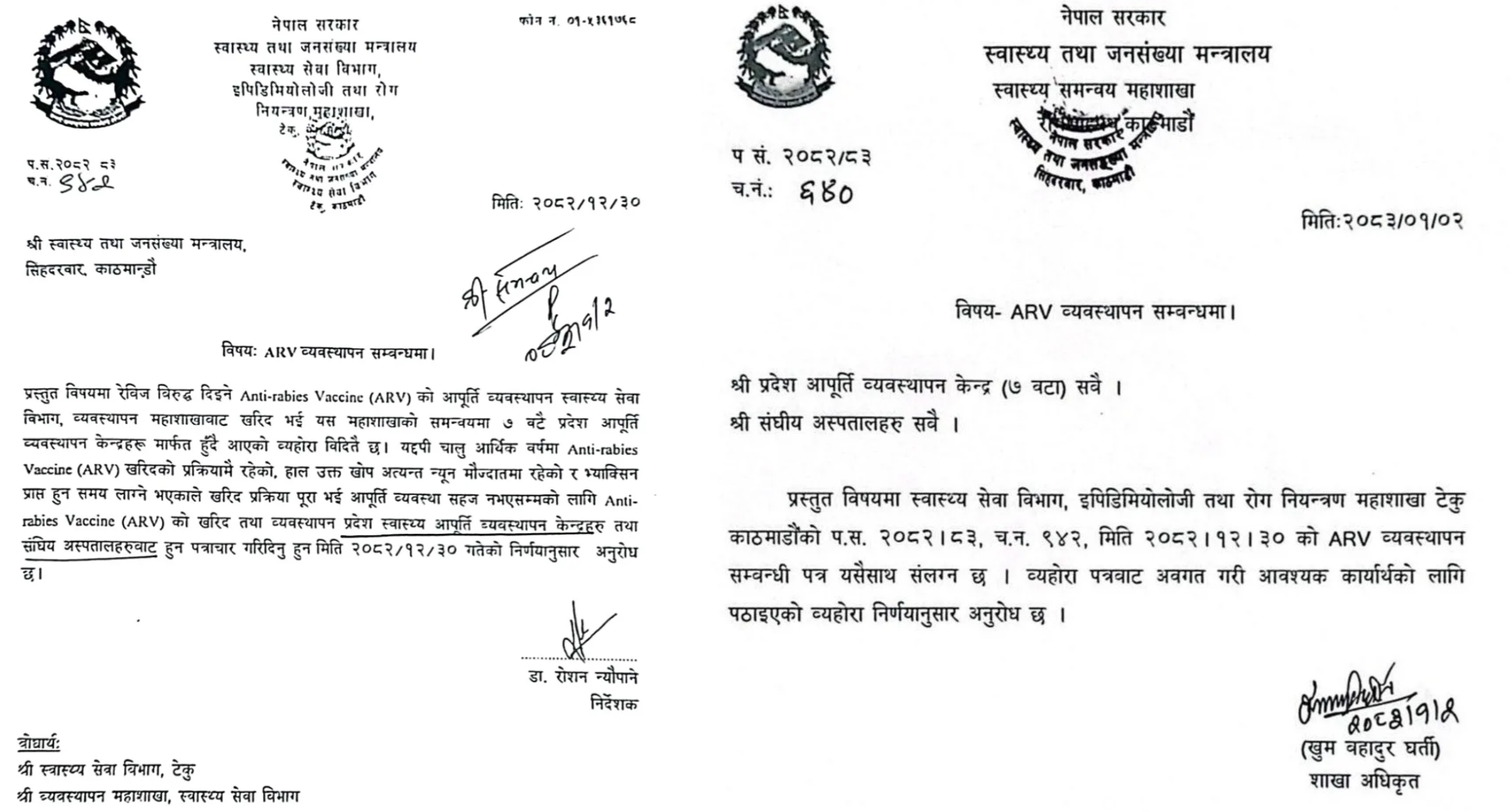 नेपालगन्जः रेबीजविरुद्ध प्रयोग हुने एआरभी (Anti–rabies Vaccine) खोपको आपूर्ति व्यवस्थापनमा स्वास्थ्य सेवा विभागको गम्भीर ढिलासुस्ती र निर्णयहीनता सतहमा आएको छ । आर्थिक वर्षको ९ महिनासम्म पनि खोप खरिद गर्न नसकेको विभागले अन्ततः चैत ३० गते प्रदेश स्वास्थ्य आपूर्ति व्यवस्थापन केन्द्र र संघीय अस्पतालहरुलाई आफैं खरिद गर्न निर्देशन दिँदै जिम्मेवारीबाट पन्छिएको छ ।