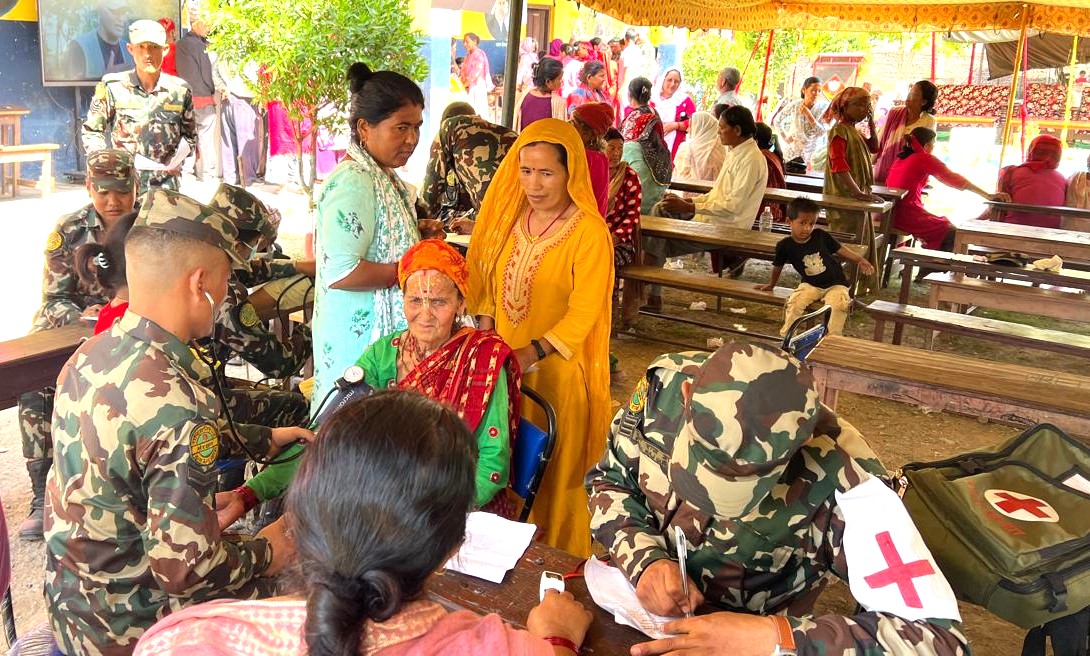 स्वास्थ्य चेकजाँचका लागि शिविरमा आएका स्थानीयको स्वास्थ्य चेकजाँच गर्दै सेनाका स्वास्थ्यकर्मी ।