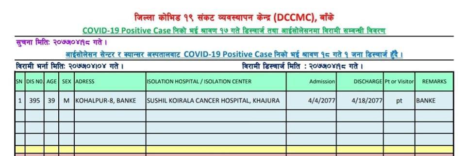 नेपालगन्ज १८, साउन । बाँकेमा आइतवार थप १ जना कोरोना भाइरस संक्रमणबाट मुक्त भएर आइसोलेसनबाट डिस्चार्ज...