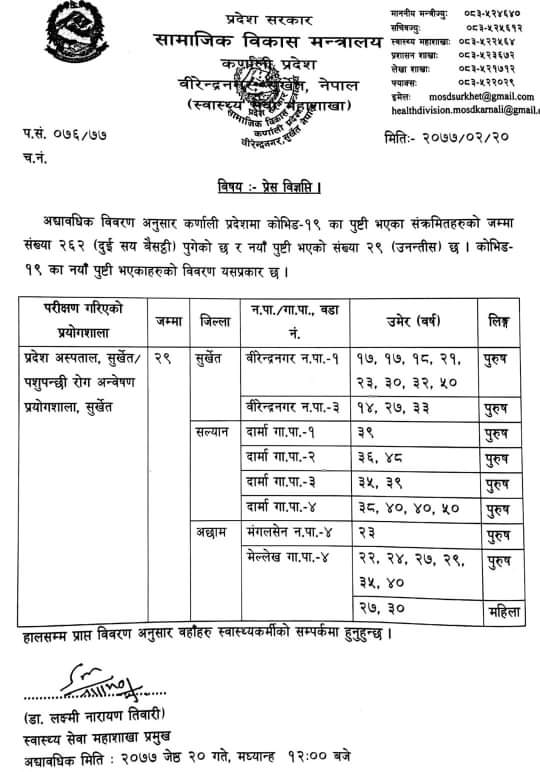 सुर्खेत २० जेष्ठ । कर्णाली प्रदेशमा मंगलबार थप २९ जनामा संक्रमण पुष्टि भएको छ । प्रदेश अस्पताल...
