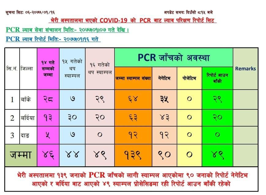 नेपालगन्ज १६ बैशाख । भेरी अस्पताल नेपालगन्जमा पिसिआर बिधिबाट कोरोना परिक्षण गरेका ९० जनाको रिपोर्ट...